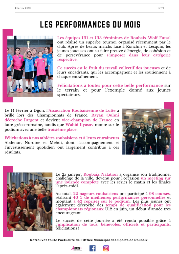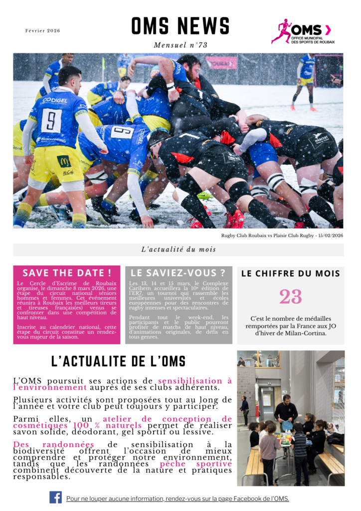 Newsletter Suivez l’actualité de l’Office Municipal Des Sports de Roubaix Newsletter n°73 - Février 2026 Télécharger Newsletter n°72 - Janvier 2026 Télécharger Newsletter n°73 - Février 2025 Télécharger Retrouvez l’ensemble des newsletters de l’Office Municipal des sports de Roubaix de l’année 2025 Newsletter n°60 - Janvier 2025 Télécharger Newsletter n°61 - Février 2025 Télécharger Newsletter n°62 - Mars 2025 Télécharger Newsletter n°63 - Avril 2025 Télécharger Newsletter n°64 - Mai 2025 Télécharger Newsletter n°65 - Juin 2025 Télécharger Newsletter n°66 - Juillet 2025 Télécharger Newsletter n°67 - Août 2025 Télécharger Newsletter n°68 - Septembre 2025 Télécharger Newsletter n°69 - Octobre 2025 Télécharger Newsletter n°70 - Novembre 2025 Télécharger Newsletter n°71 - Décembre 2025 Télécharger Retrouvez l’ensemble des newsletters de l’Office Municipal des sports de Roubaix de l’année 2024 Newsletter n°48 - Janvier 2024 Télécharger Newsletter n°49 - Février 2024 Télécharger Newsletter n°50 - Mars 2024 Télécharger Newsletter n°51 - Avril 2024 Télécharger Newsletter n°52 - Mai 2024 Télécharger Newsletter n°53 - Juin 2024 Télécharger Newsletter n°54 - Juillet 2024 Télécharger Newsletter n°55 - Août 2024 Télécharger Newsletter n°56 - Septembre 2024 Télécharger Newsletter n°57 - Octobre 2024 Télécharger Newsletter n°58 - Novembre 2024 Télécharger Newsletter n°59 - Décembre 2024 Télécharger Retrouvez l’ensemble des newsletters de l’Office Municipal des sports de Roubaix de l’année 2023 Newsletter n°36 - Janvier 2023 Télécharger Newsletter n°37 - Février 2023 Télécharger Newsletter n°38 - Mars 2023 Télécharger Newsletter n°39 - Avril 2023 Télécharger Newsletter n°40 - Mai 2023 Télécharger Newsletter n°41 - Juin 2023 Télécharger Newsletter n°42 - Juillet 2023 Télécharger Newsletter n°43 - Août 2023 Télécharger Newsletter n°44 - Septembre 2023 Télécharger Newsletter n°45 - Octobre 2023 Télécharger Newsletter n°46 - Novembre 2023 Télécharger Newsletter n°47 - Décembre 2023 Télécharger